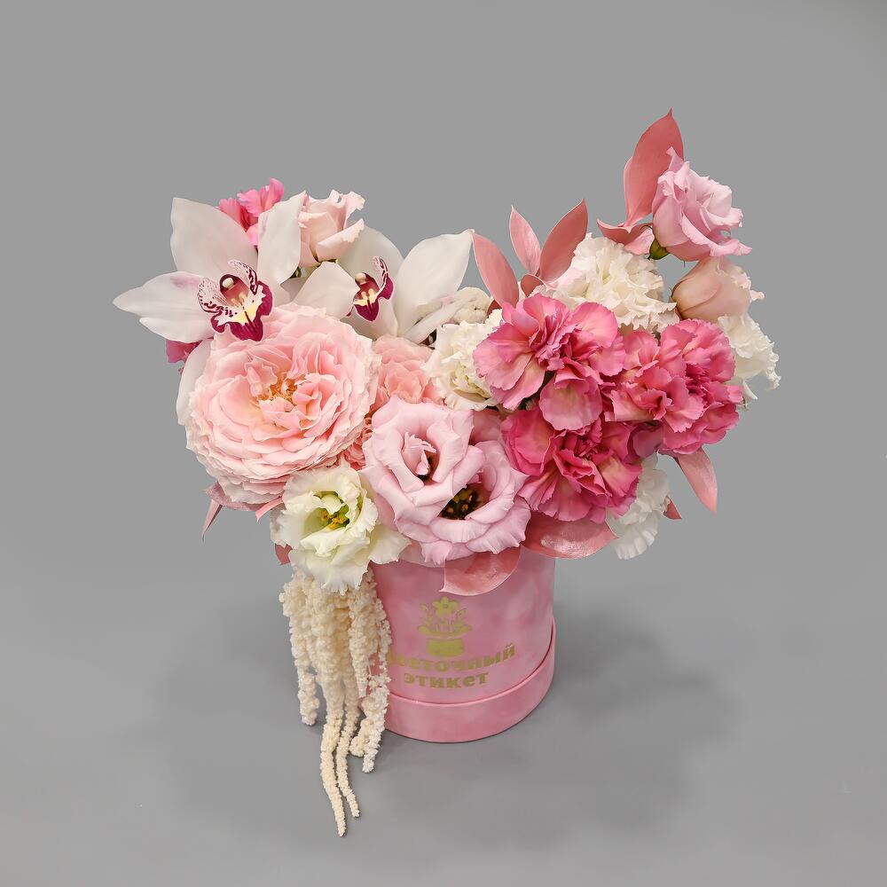 Пионовидная роза – 2 шт.Орхидея Цимбидиум – 2 шт.Эустома – 2 шт.Рускус – 5 шт.Гвоздика – 5 шт.Сантини – 3 шт.Амарант – 1 шт.Тишью – 1 шт.Шляпная коробка – 1 шт.