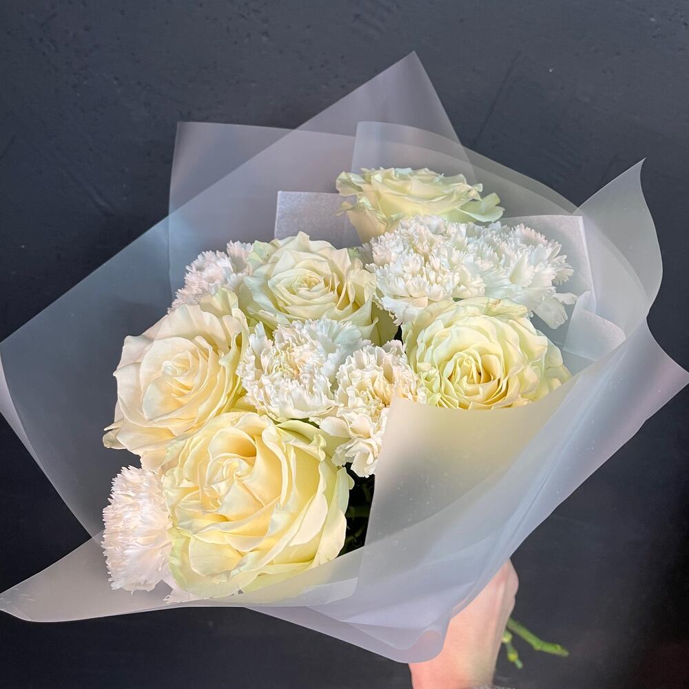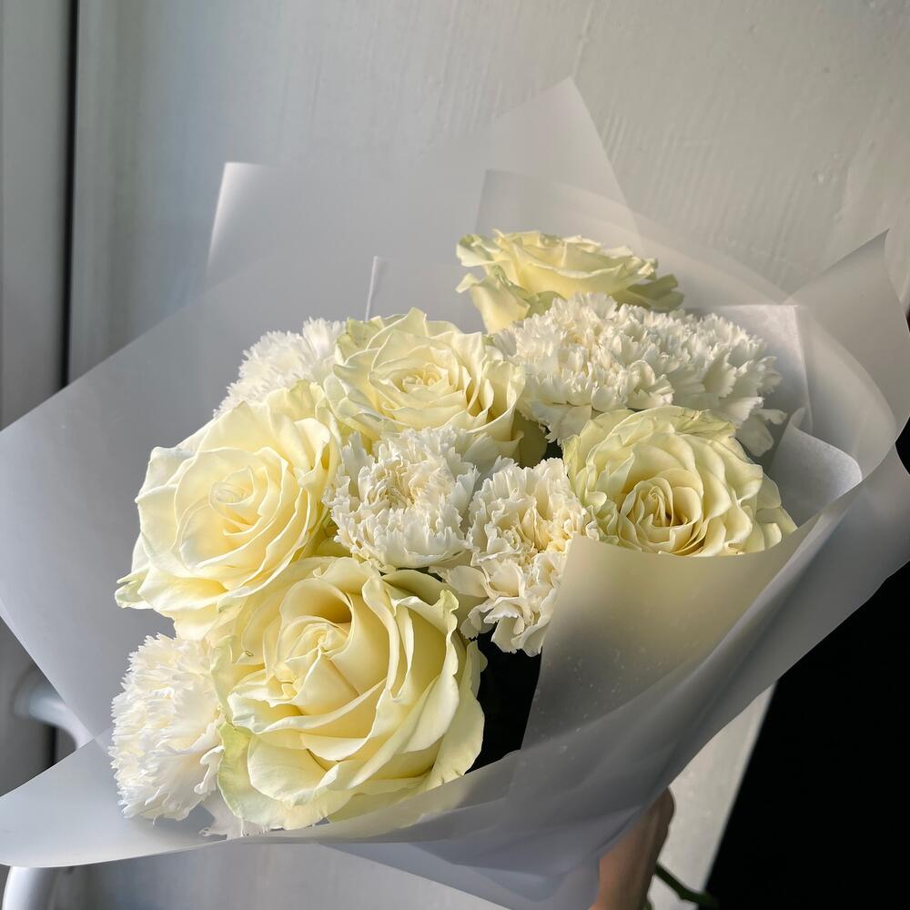 Диантус – 6 шт.Роза мондиаль 50 см – 5 шт.Упаковка дизайнерская – 1 шт.