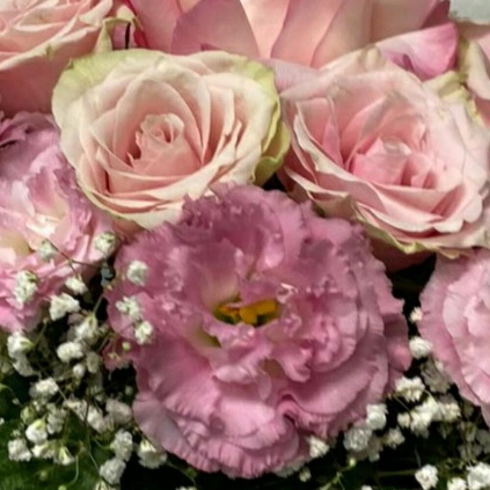 Гипсофила – 2 шт. Роза розовая – 7 шт. Лизиантус розовый – 5 шт.