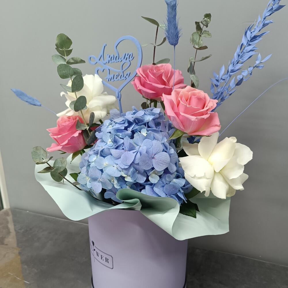 Гортензия – 1 шт. Сухоцветы – 1 шт. Открыточка с вашими пожеланиями – 1 шт. Голландская роза – 5 шт. Эвкалипт – 4 шт.