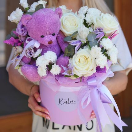 Лизиантус – 3 шт.Маттиола – 3 шт.Озотамнус – 3 шт.Роза кустовая – 3 шт.Роза одноголовая – 3 шт.Гвоздика – 3 шт.Коробка шляпная – 1 шт.комплимент от polyanka – 1 шт.