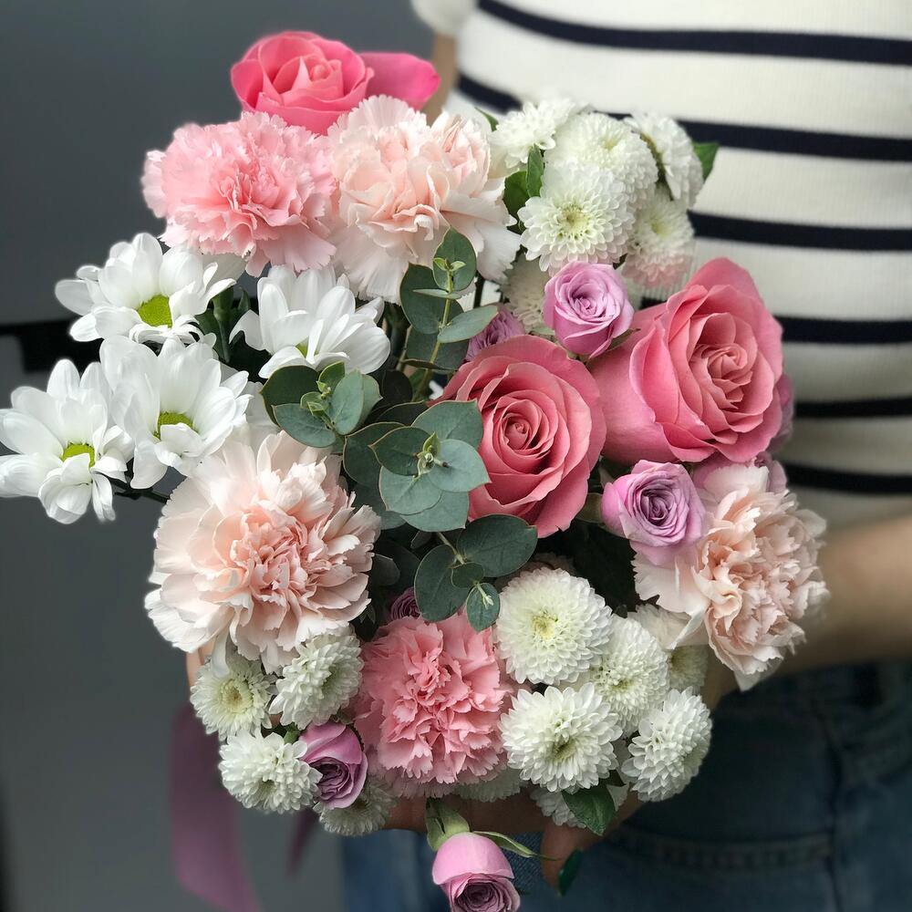 Гвоздики, Кустовые розы, Пионовидные розы, Розы