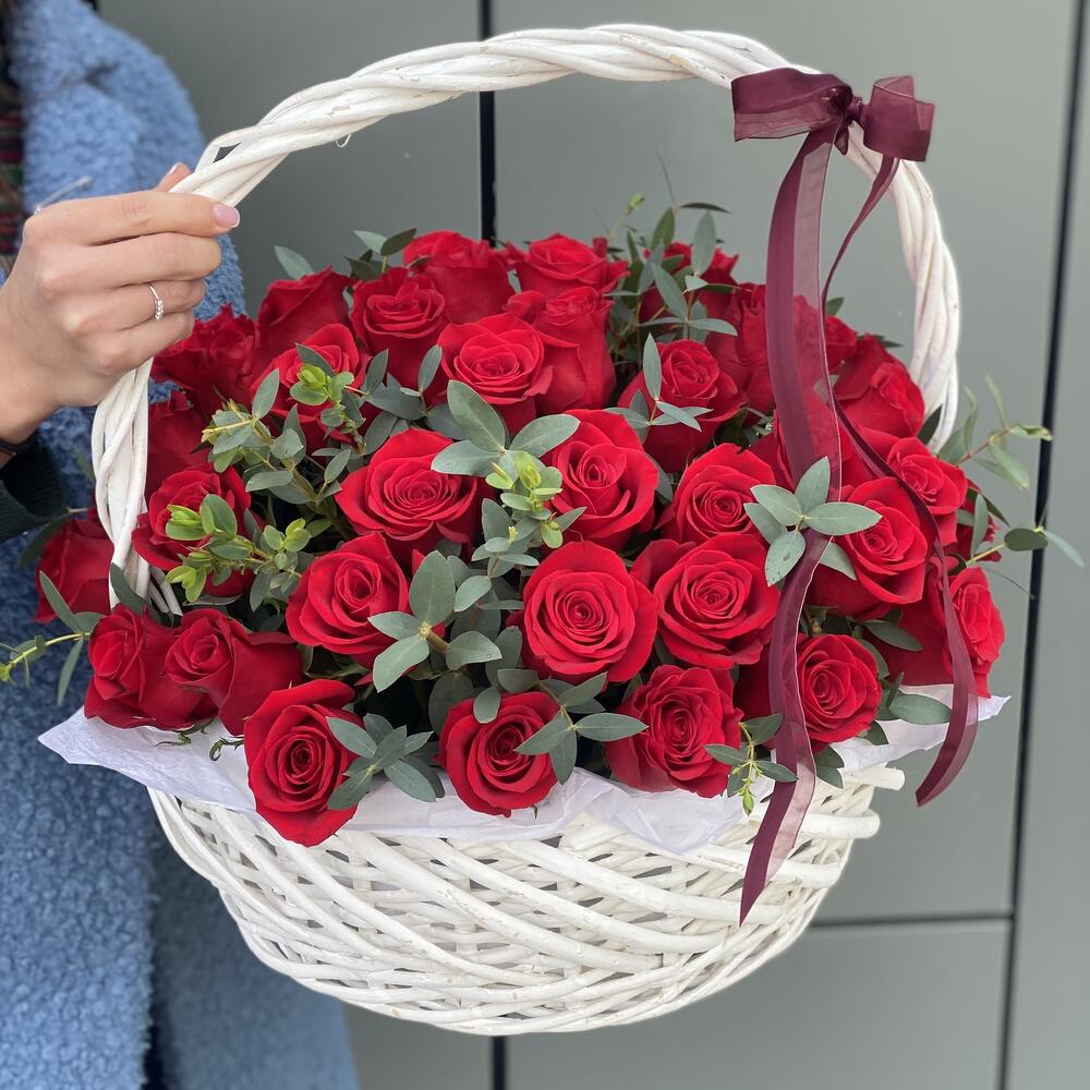 красная роза фридом – 51 шт. Эвкалипт – 3 шт. Корзина – 1 шт. Оазис – 4 шт.