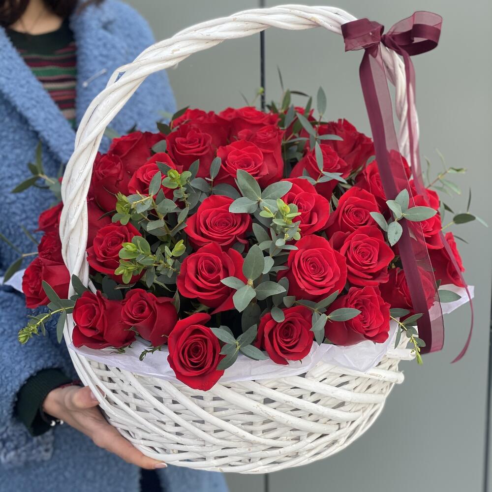 Метки: 14 февраля, 51 роза, от 5000 руб, Роза 30 см, Розы в корзине, цветы в корзине