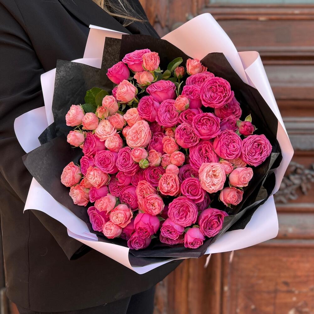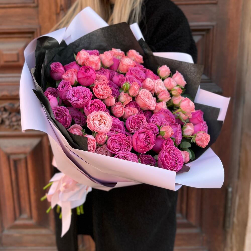Лента атласная – 2 шт.Тишью – 2 шт.Пионовидная кустовая роза – 21 шт.Пленка матовая – 2 шт.