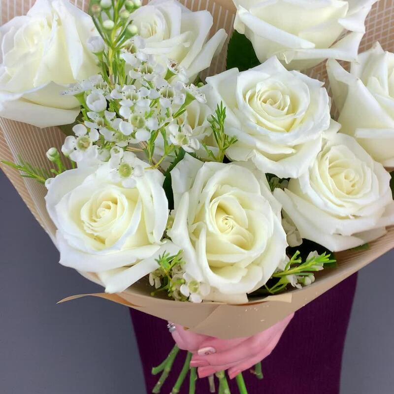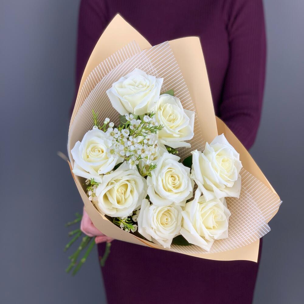 Роза белая – 9 шт.Ваксфлауэр – 1 шт.Упаковка дизайнерская – 1 шт.