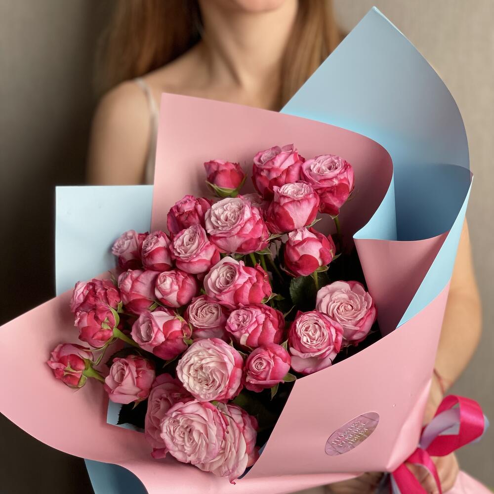 Кустовая роза – 7 шт. Упаковка – 1 шт. Атласная лента – 1 шт.