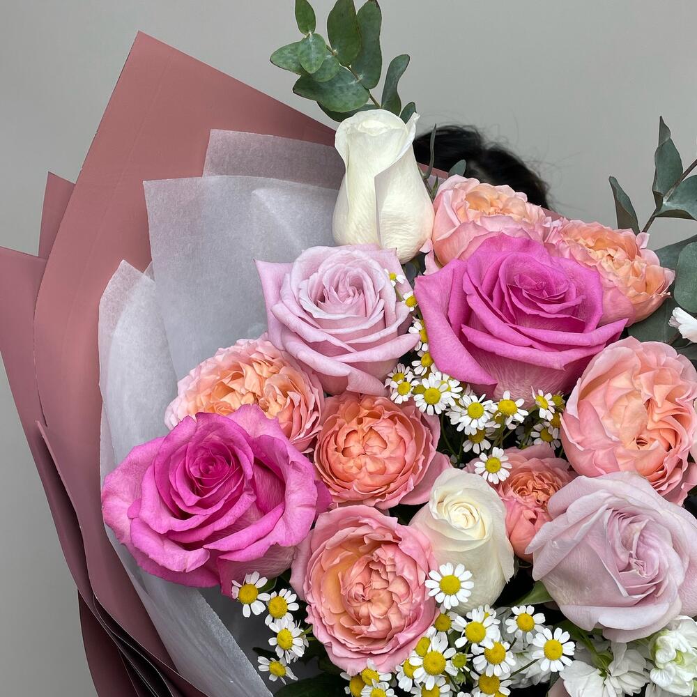 Гвоздики, Кустовые розы, Пионовидные розы, Розы