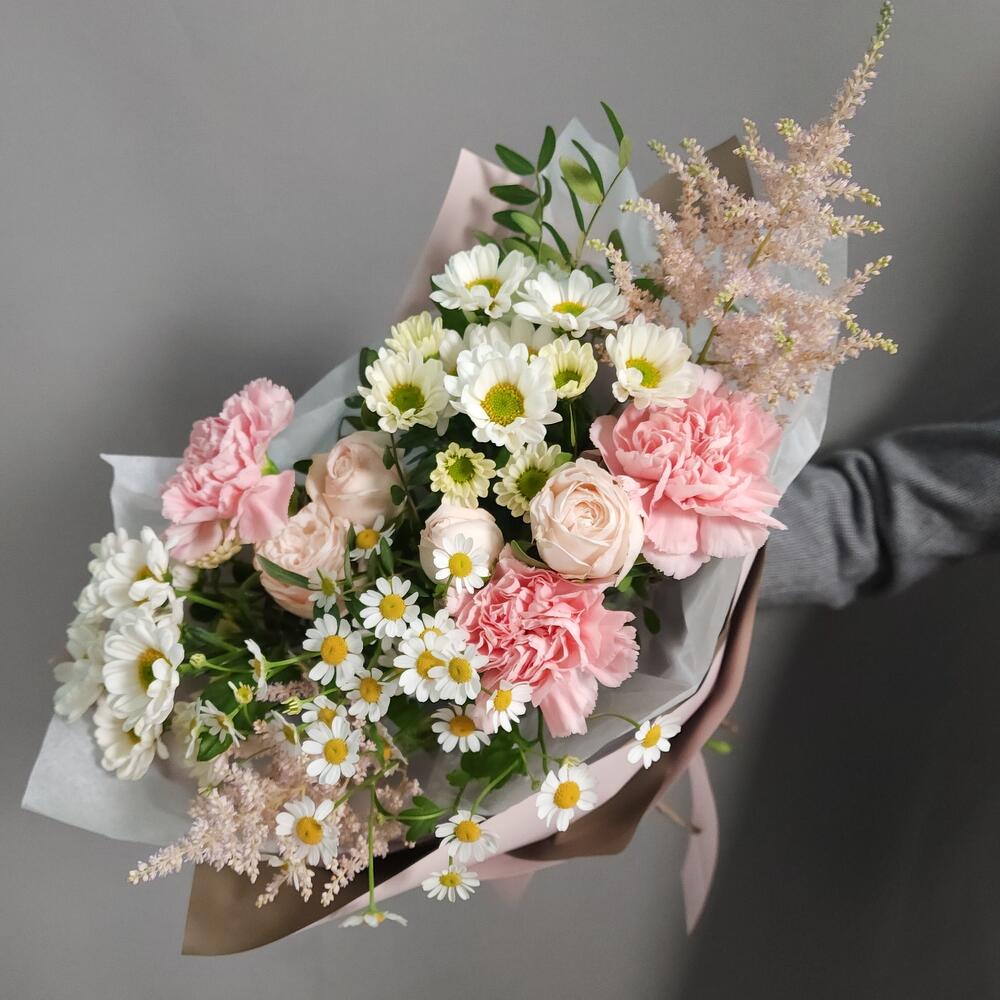 Альстромерии, Кустовые розы, Лизиантусы, Пионовидные розы, Розы, Ромашки
