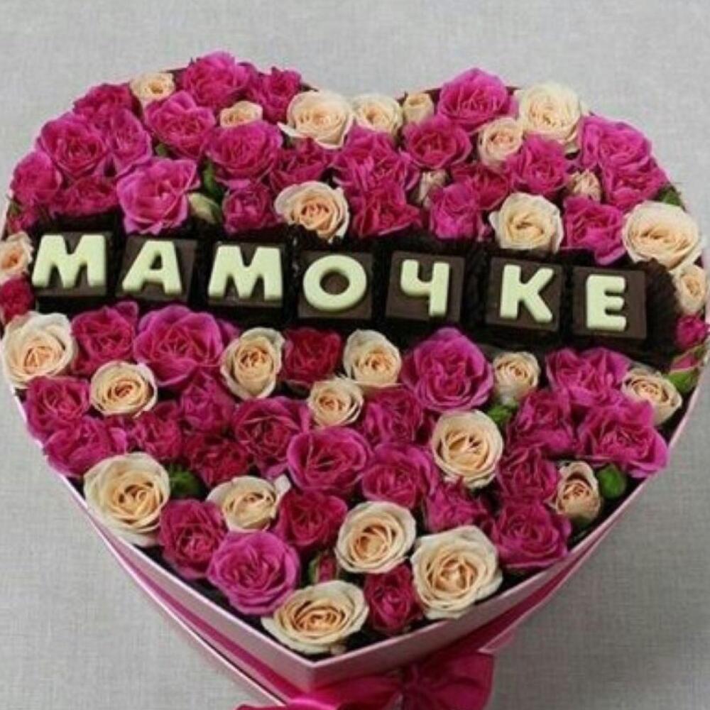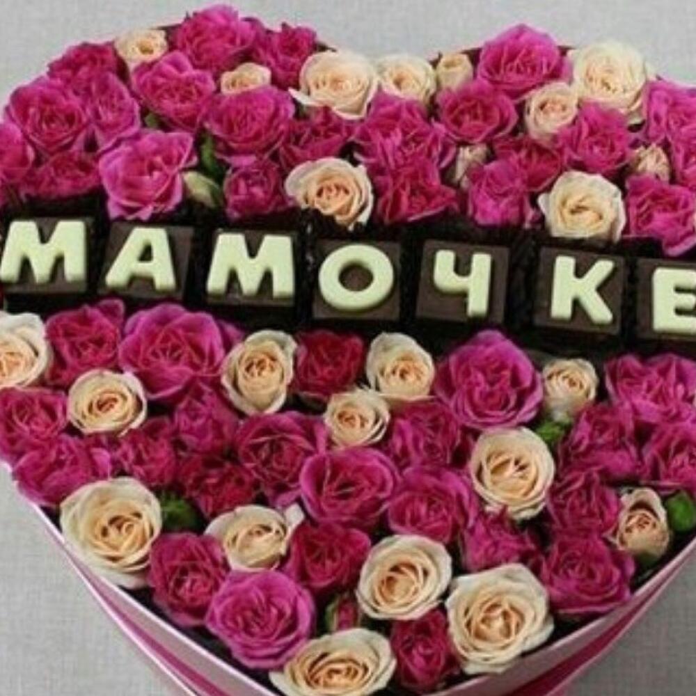 Нежная коробочка с кустовыми розами и вкусными шоколадными буквами, станет прекрасным подарком самому близкому и родному человеку маме