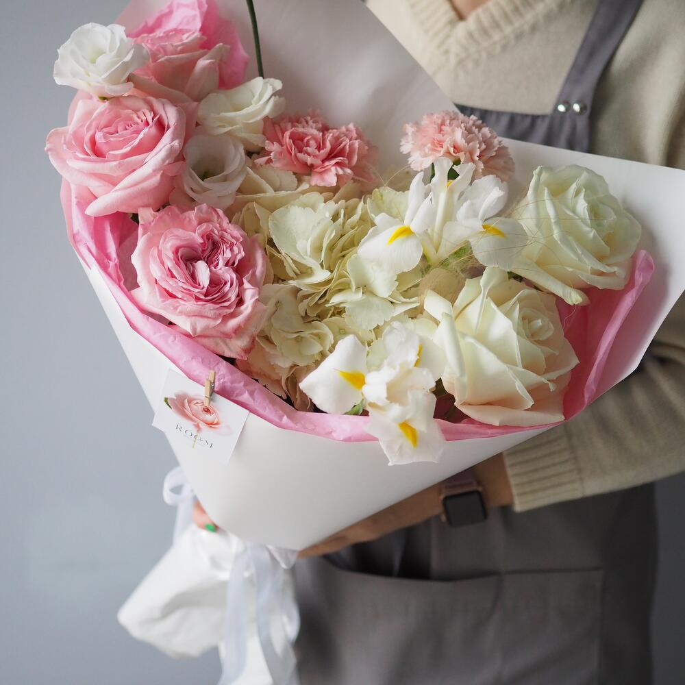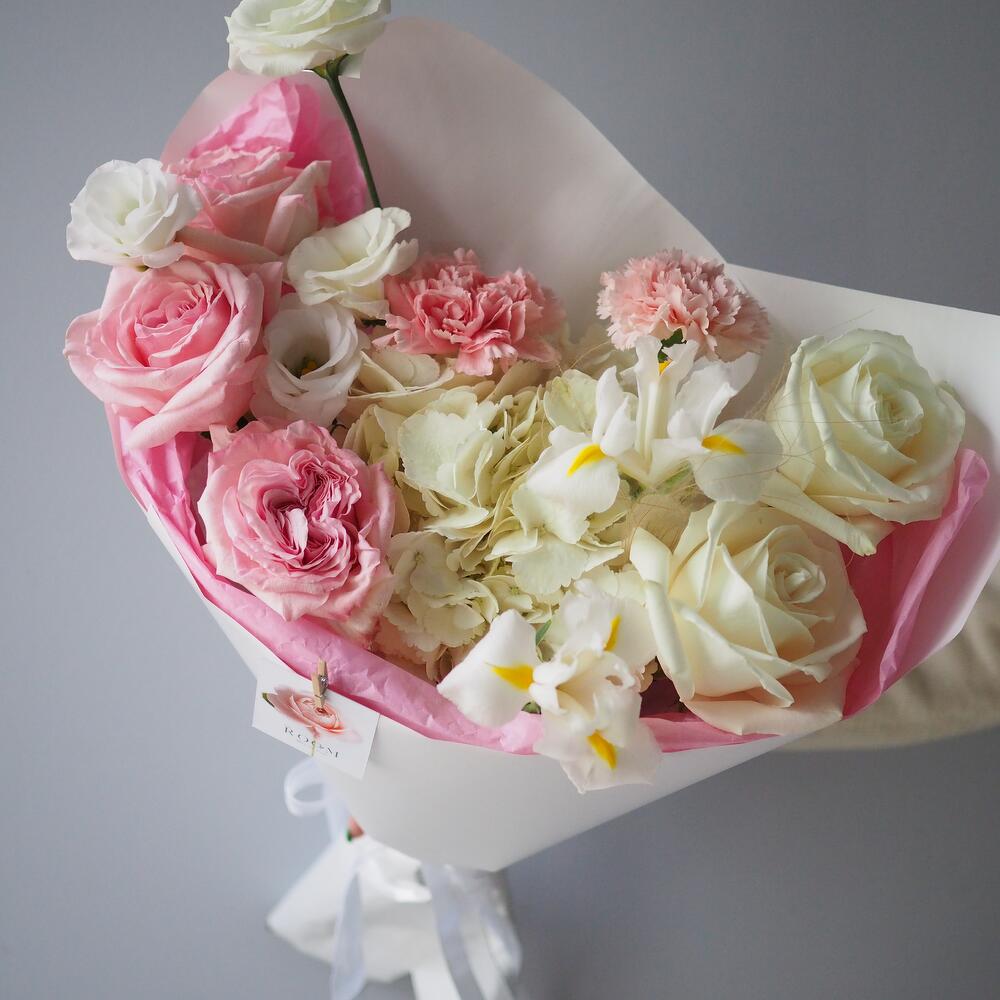 Альстромерии, Гвоздики, Кустовые розы, Лизиантусы, Розы, Хризантемы