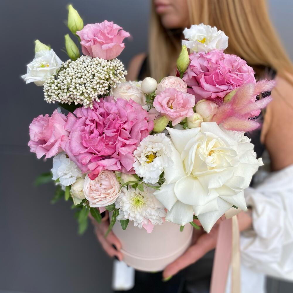 Шляпная коробка с розами и лизиантусом