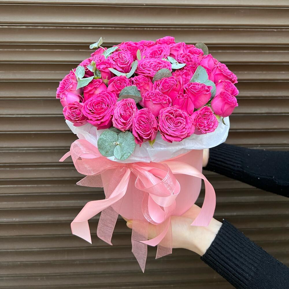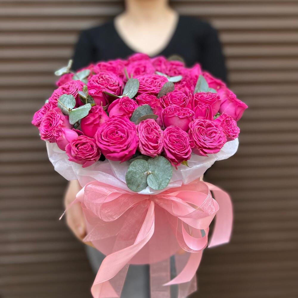 Эвкалипт – 1 шт.Лента атласная – 2 шт.Тишью – 1 шт.Коробка шляпная – 1 шт.Оазис флористический – 1 шт.классик сенсейшен – 11 шт.