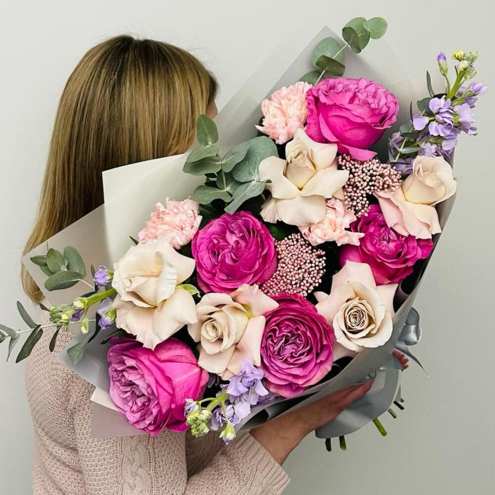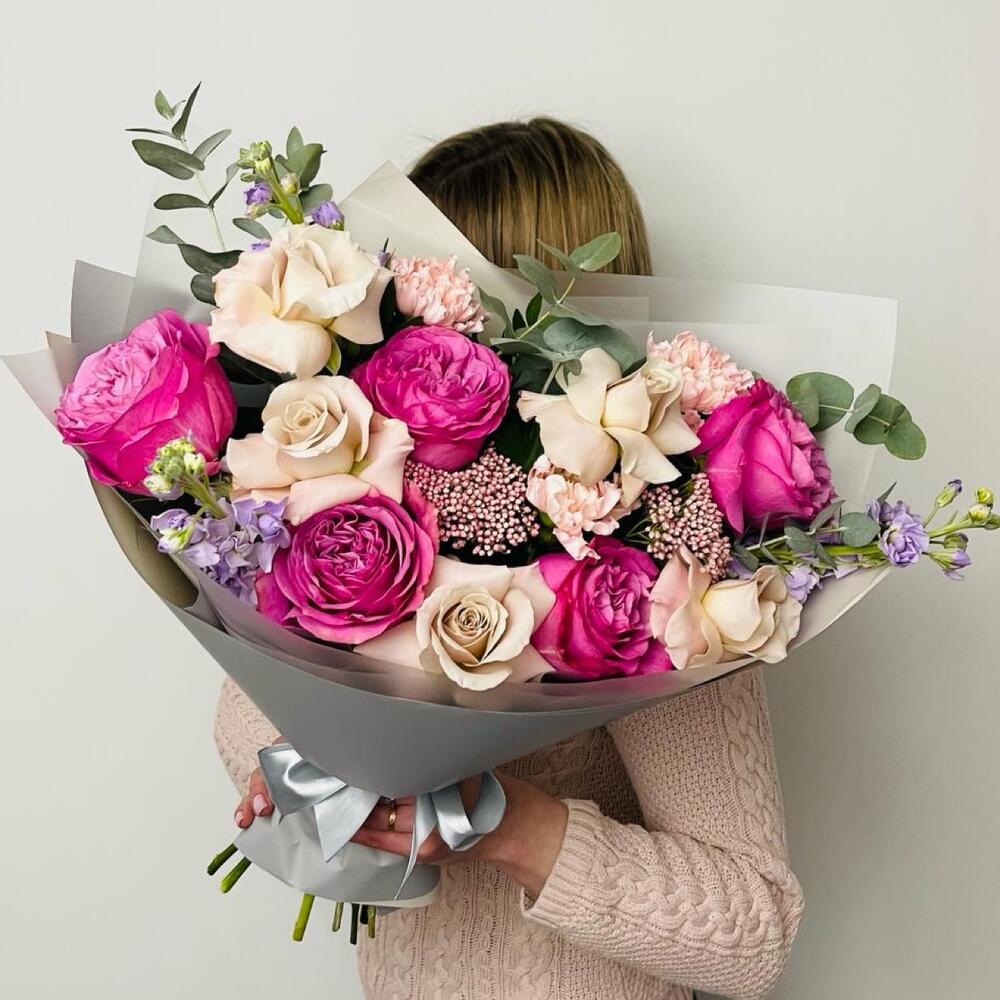 Роза Эквадор – 5 шт.Роза – 6 шт.Озотамнус – 2 шт.Диантус – 3 шт.Маттиола – 3 шт.Эвкалипт – 3 шт.Упаковка дизайнерская – 3 шт.