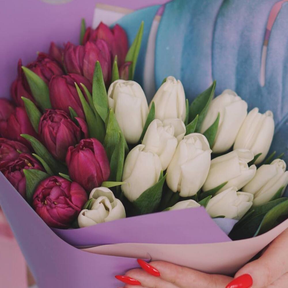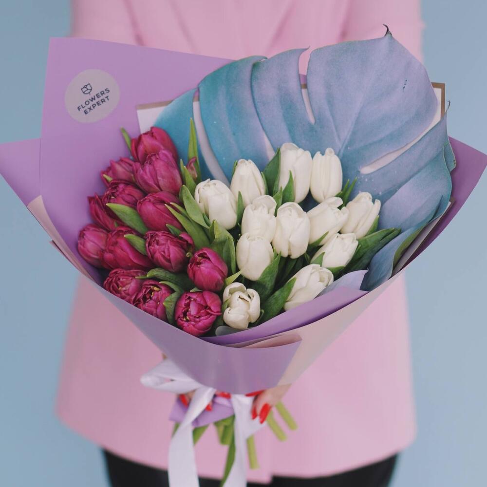 Тюльпан пионовидный – 25 шт.Монстера – 1 шт.Упаковка дизайнерская – 1 шт.
