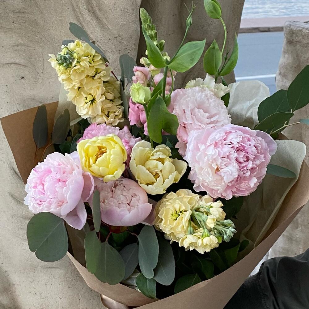 Пион – 3 шт.Маттиола – 2 шт.Львиный зев – 1 шт.Тюльпан махровый – 3 шт.Лизиантус – 1 шт.Эвкалипт – 3 шт.Упаковка – 1 шт.