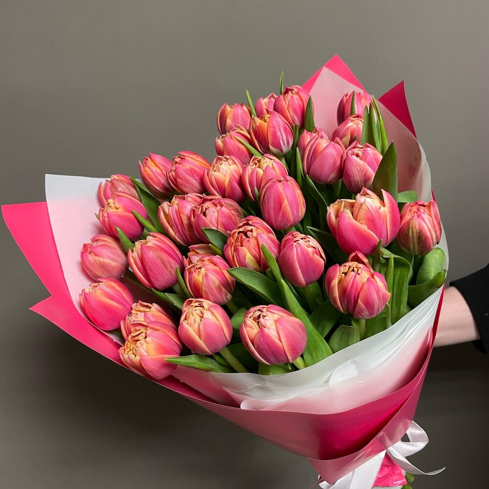 Яркий, большой, объемный букет из 31 пионовидного тюльпана. Эффектный подарок!
